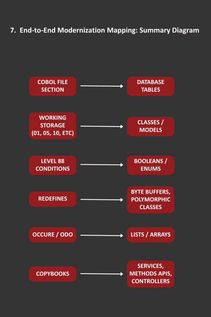 COBOL structures data in fixed layouts defined by PIC clauses and item levels. Java and .NET do not have native equivalents. When migrating, every record definition must be translated to a modern class with the same byte-level meaning.