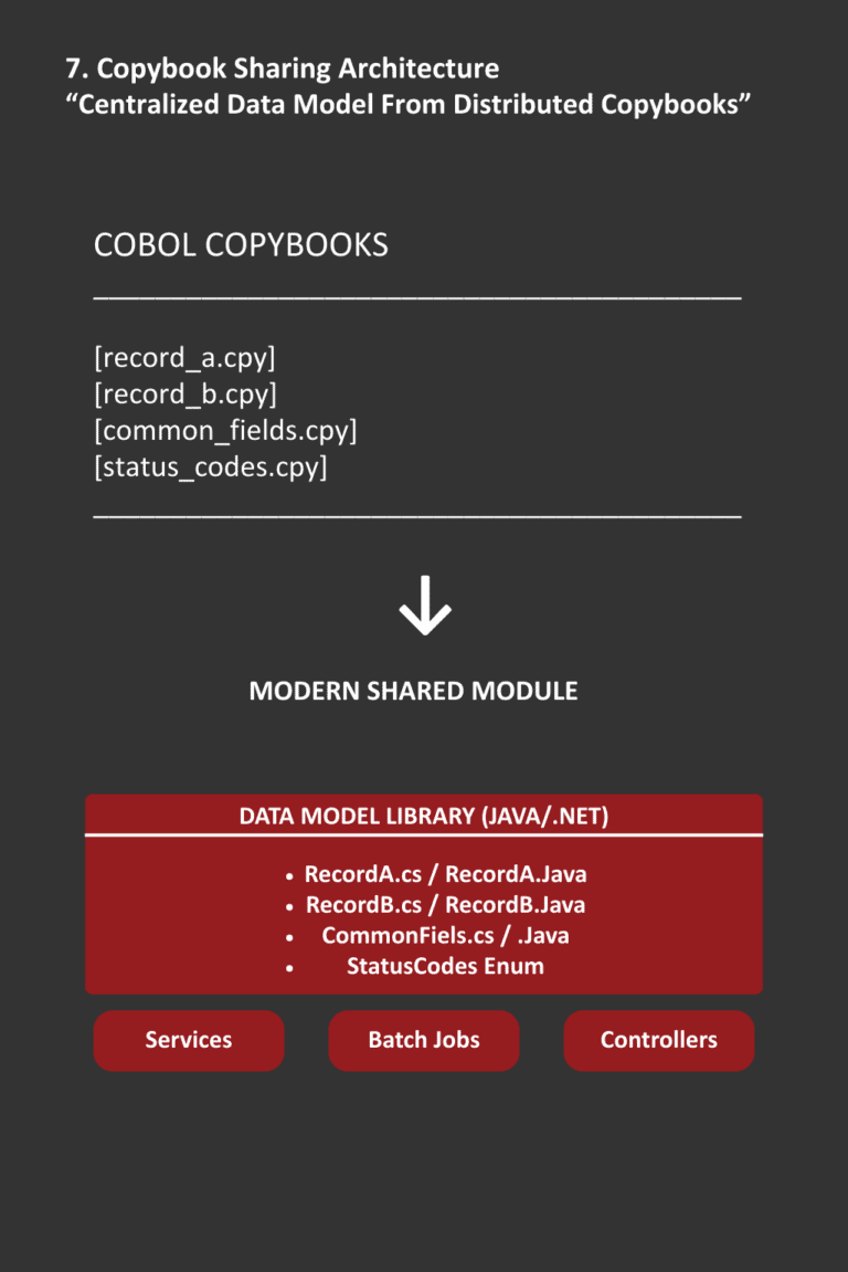 - Copybooks must be transformed into shared Java classes or C# classes.